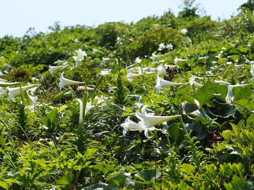目の前に広がる草原と、どこまでも広がる大海原。初めての人は是非一度は訪れて欲しいポイント。 4月~5月には真っ白なテッポウユリが見頃を迎える。 【注意】島尻毛散策道は草が延びやすく、雨が降るとぬかるみ、ハブも出やすくなります。 草の背丈が短い、晴れた日に行きましょう。