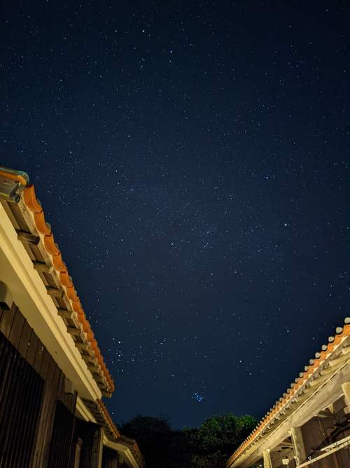 晴れていれば、一年中美しい星空を観測できる。フクギに囲まれた屋敷の庭から、灯りを消して見上げれば満天の星が見られる。 フットライトなどで明るい場合は、あがり浜からアンジェーラ浜まで向かう道の途中(公衆トイレを過ぎた辺り)で観察するのがおススメ。 天の川も見られるかも?